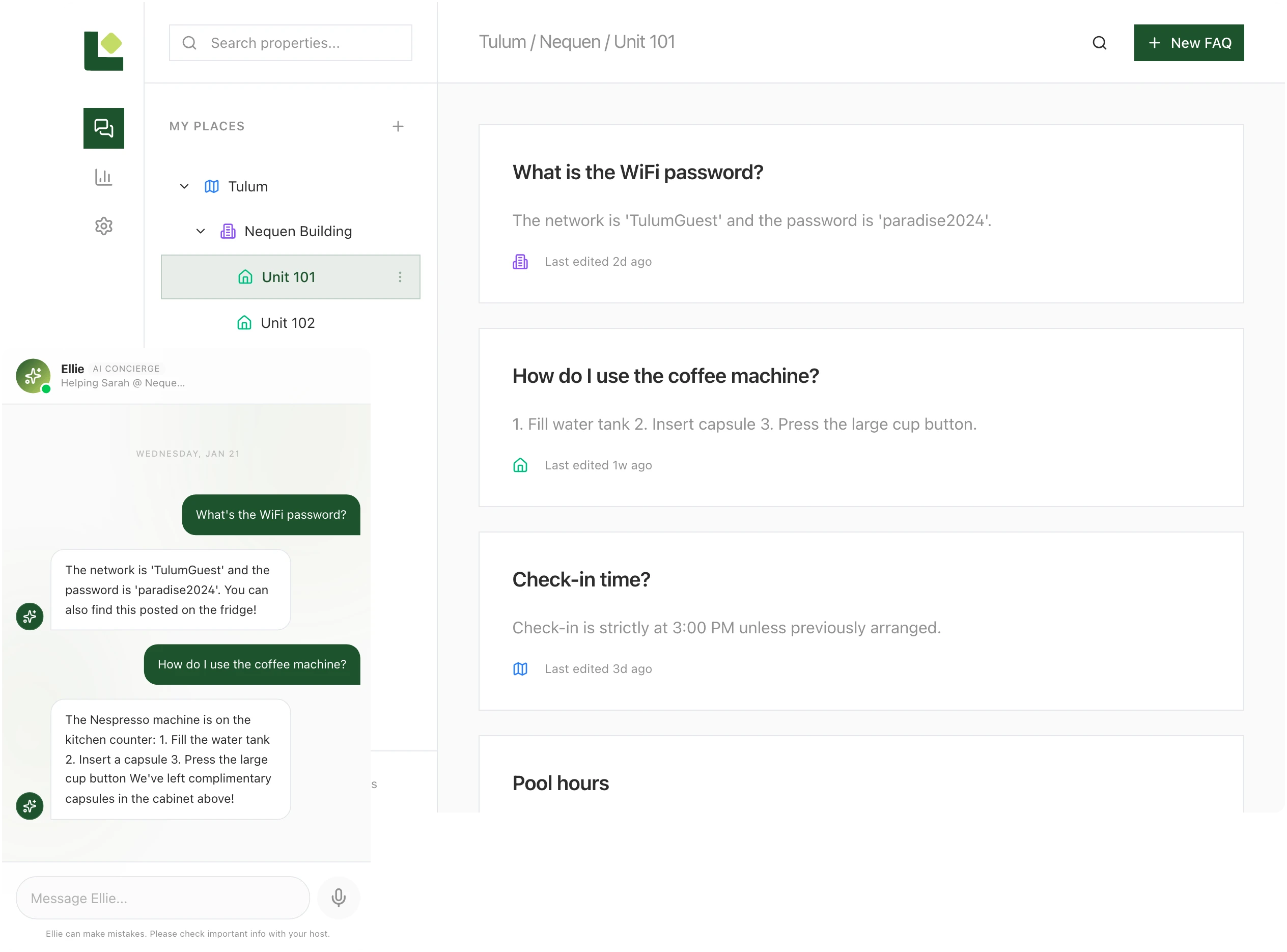 Ellie answers guest questions instantly—WiFi, checkout, how to work the TV. She knows your property because you told her once. Now she handles the rest.