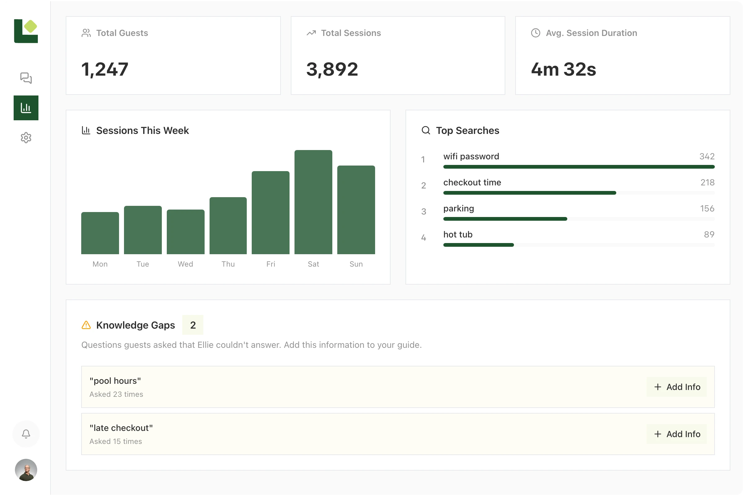 Analytics show what guests are asking. When Ellie can't answer something, you'll know—and can add it to your knowledge base.